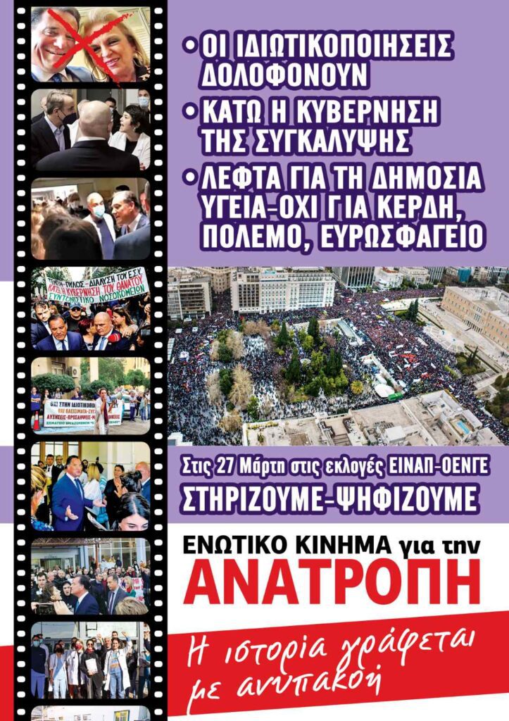 Συνάδελφοι συναδέλφισσες, οι εκλογές στις 27 Μάρτη για τα συνδικαλιστικά μας όργανα σε ΕΙΝΑΠ και ΟΕΝΓΕ είναι οι πιο κρίσιμες των τελευταίων δεκαετιών. Κρίνεται αν θα συνεχιστεί η πορεία διάλυσης και ιδιωτικοποίησης της δημόσιας υγείας Ή αν οι γιατροί του ΕΣΥ αντιτάξουμε Ενωτικό Κίνημα Ανατροπής αυτής της τυχοδιωκτικής πολιτικής. Κρίνεται αν θα συνεχιστεί η καταβύθιση των μισθών μας, η εργασιακή εξόντωση, η αντιδραστική πειθάρχηση με τα «εντέλλεσθε» Ή αν βάλουμε STOP στη φτωχοποίηση και την υπερεφημέρευση, διεκδικήσουμε και κατακτήσουμε γενναίες αυξήσεις μισθών-εφημεριακής αποζημίωσης, ανθρώπινα ωράρια. Κρίνεται αν θα συνεχιστεί το μαζικό κύμα φυγής και το διάχυτο αίσθημα απογοήτευσης των νέων γιατρών Ή αν αγωνιστούμε για ένα σύστημα υγείας δημόσιο, αναπτυγμένο, που θα σέβεται τον ασθενή και δεν θα τον πετάει στα ράντζα, ελκυστικό για τους γιατρούς και όλους τους υγειονομικούς, χωρίς ιδιωτικά μαγαζιά και παραμάγαζα (πρωινά ή απογευματινά). Κρίνεται αν θα αλλάξει επιτέλους ο συσχετισμός στο συνδικαλιστικό ιατρικό κίνημα και δεν θα έχουμε προέδρους και προεδρεία παραρτήματα της κυβέρνησης ή κήρυκες της ηττοπάθειας, που διαρκώς διαπιστώνουν ότι οι γιατροί είναι «ανώριμοι» και ανήμποροι να αντιδράσουν δυναμικά.