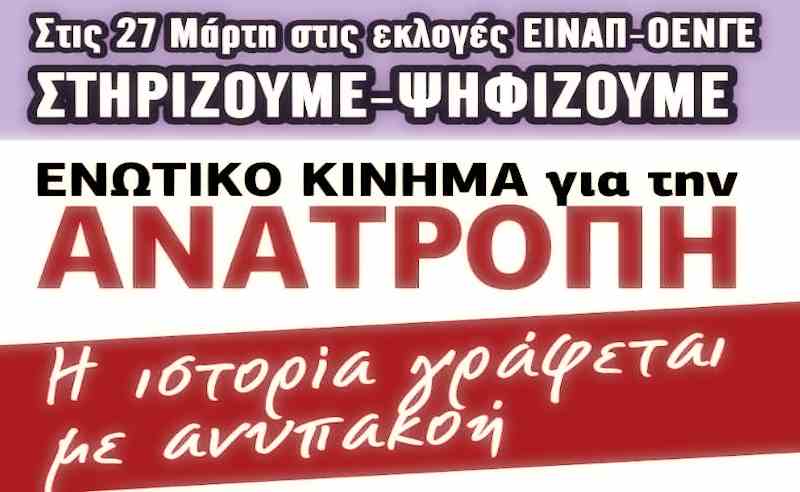 Το ΕΝΩΤΙΚΟ ΚΙΝΗΜΑ για την ΑΝΑΤΡΟΠΗ καλεί τους νοσοκομειακούς γιατρούς να ψηφίσουν ελεύθερα, χωρίς εκβιασμούς και πιέσεις. Για ΕΙΝΑΠ, ΟΕΝΓΕ, νοσοκομειακό κίνημα ανατροπής και δικαιοσύνης. Για να καταθέσουμε τη δική μας αγωνιστική πρόταση δυσπιστίας. Γιατί μας αξίζει μια καλύτερη μέρα στη δημόσια υγεία και την ιατρική.