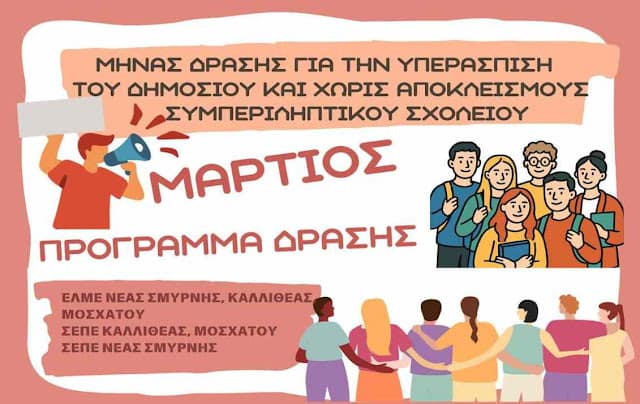 Ο Σύλλογος Πρωτοβάθμιας Εκπαίδευσης Καλλιθέας – Μοσχάτου και η ΕΛΜΕ Νέας Σμύρνης – Καλλιθέας – Μοσχάτου οργανώνουν σειρά εκδηλώσεων στα πλαίσια του μήνα δράσης για την υπεράσπιση του Δημόσιου και χωρίς αποκλεισμούς συμπεριληπτικού σχολείου.