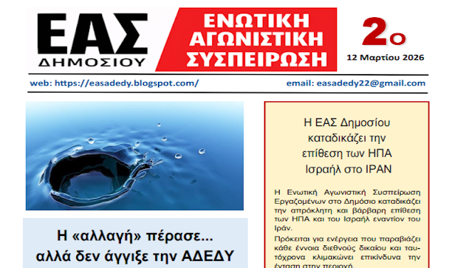 ΑρχικήΑΝΑΚΟΙΝΩΣΕΙΣ ΑΝΑΚΟΙΝΩΣΕΙΣ Κυκλοφόρησε το 2ο ηλεκτρονικό ενημερωτικό φυλλάδιο της Ενωτικής Αγωνιστικής Συσπείρωσης Δημοσίου. By admin 11 Μαρτίου 2026 0 34 FacebookXPinterestWhatsApp Κυκλοφόρησε το 2ο ηλεκτρονικό ενημερωτικό φυλλάδιο της Ενωτικής Αγωνιστικής Συσπείρωσης Δημοσίου. μερίδιο FacebookXPinterestWhatsApp Προηγούμενο άρθροΜήνα δράσης για την υπεράσπιση του Δημόσιου και χωρίς αποκλεισμούς συμπεριληπτικού σχολείουΕπόμενο άρθροΜεγάλη αντιπολεμική συγκέντρωση χθες στο Σύνταγμα και πορεία στην Πρεσβεία των ΗΠΑ adminhttps://workersnews.gr Related Articles ΑΠΟ ΤΟΥΣ ΧΩΡΟΥΣ ΔΟΥΛΕΙΑΣ Απεργιακή κινητοποίηση την Δευτέρα 23 Μαρτίου στη MEDICHROM ΑΝΑΚΟΙΝΩΣΕΙΣ Πότε θα σπάσει τη σιωπή της η ΑΔΕΔΥ για τον πόλεμο και την ακρίβεια; ΑΝΑΚΟΙΝΩΣΕΙΣ Ομιλία της Β. Πασχάλη στην εκδήλωση της Παρέμβασης για την υγεία ΑΦΗΣΤΕ ΜΙΑ ΑΠΑΝΤΗΣΗ Ακύρωση απάντησης Σχόλιο: εισάγετε το σχόλιό σας! Όνομα: παρακαλώ εισάγετε το όνομά σας εδώ Email: έχετε εισάγει εσφαλμένη διεύθυνση ηλεκτρονικού ταχυδρομείου! παρακαλώ εισάγετε εδώ την ηλεκτρονική σας διεύθυνση Ιστοσελίδα: αποθηκεύστε το όνομα, το ηλεκτρονικό ταχυδρομείο και τον ιστότοπό μου σε αυτό το πρόγραμμα περιήγησης για την επόμενη φορά που θα σχολιάσω. Stay Connected0ΥποστηρικτέςΚάντε Like0ΑκόλουθοιΑκολουθήστε0ΣυνδρομητέςΓίνετε συνδρομητής - Advertisement - Latest Articles ΑΠΟ ΤΟΥΣ ΧΩΡΟΥΣ ΔΟΥΛΕΙΑΣ Απεργιακή κινητοποίηση την Δευτέρα 23 Μαρτίου στη MEDICHROM ΑΝΑΚΟΙΝΩΣΕΙΣ Πότε θα σπάσει τη σιωπή της η ΑΔΕΔΥ για τον πόλεμο και την ακρίβεια; ΑΝΑΚΟΙΝΩΣΕΙΣ Ομιλία της Β. Πασχάλη στην εκδήλωση της Παρέμβασης για την υγεία ΣΤΟ ΔΡΟΜΟ Μεγάλη αντιπολεμική συγκέντρωση χθες στο Σύνταγμα και πορεία στην Πρεσβεία των ΗΠΑ ΣΤΟ ΔΡΟΜΟ Μήνα δράσης για την υπεράσπιση του Δημόσιου και χωρίς αποκλεισμούς συμπεριληπτικού σχολείου Φόρτωση περισσοτέρων
